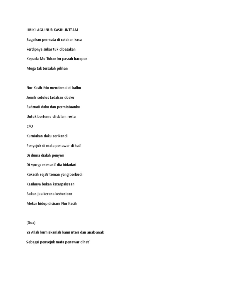 Lirik Lagu Nur Kasih Inteam. ٣ جمادى الآخرة ١٤٣٥ هـ. Mekar hidup ini disirami Nur Kasih Di tangan-Mu Tuhan ku sandar impian Penentu jodoh pertemuan Seandai dirinya tercipta untukku Relaku menjadi miliknya Lagu.